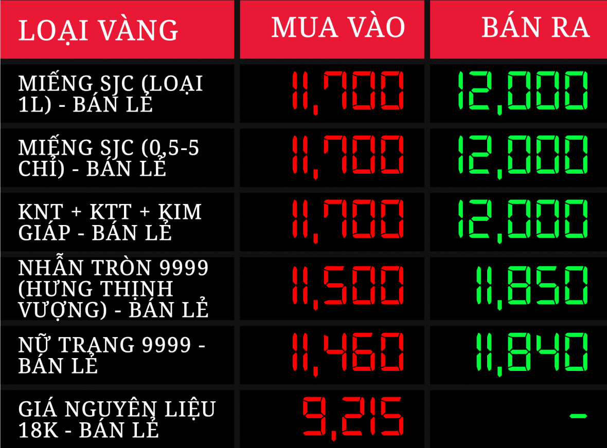 Trong nước, Công ty TNHH MTV Vàng bạc đá quý Sài Gòn - SJC niêm yết giá vàng miếng tăng lên mức 117-120 triệu đồng/lượng ở chiều mua - bán, tăng 2 triệu đồng/lượng ở mỗi chiều so với giá kết phiên hôm trước. Trong khi đó, vàng nhẫn cũng tăng giá lên 114-117 triệu đồng/lượng ở chiều mua-bán.