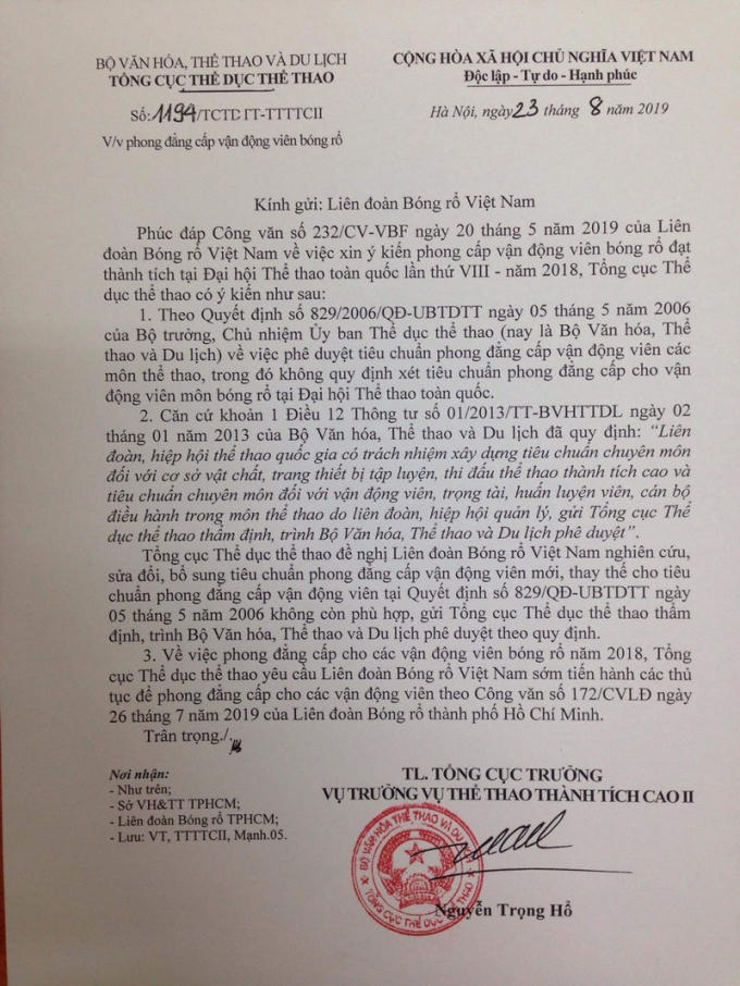 Cụ thể, đại diện VBF là Tổng thư ký Lê Hoàng Anh đã ký các văn bản từ chối phong cấp cho các VĐV đạt thành tích ở giải bóng rổ thuộc khuôn khổ Đại hội Thể thao toàn quốc lần thứ 8 vừa diễn ra cuối năm 2018 tại Hà Nội với lý do tiêu chuẩn phong đẳng cấp VĐV bóng rổ được ban hành kèm theo Quyết định 829 đang có hiệu lực thi hành không quy định VĐV đạt giải tại Đại hội Thể thao toàn quốc được phong đẳng cấp.