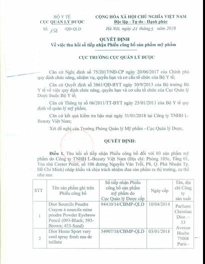 Theo đó, Cục Quản lý Dược, Bộ Y tế đã công văn gửi Sở Y tế các tỉnh thành phố, thông báo việc đình chỉ lưu hành, thu hồi 3 sản phẩm của thương hiệu nổi tiếng thế giới Dior.