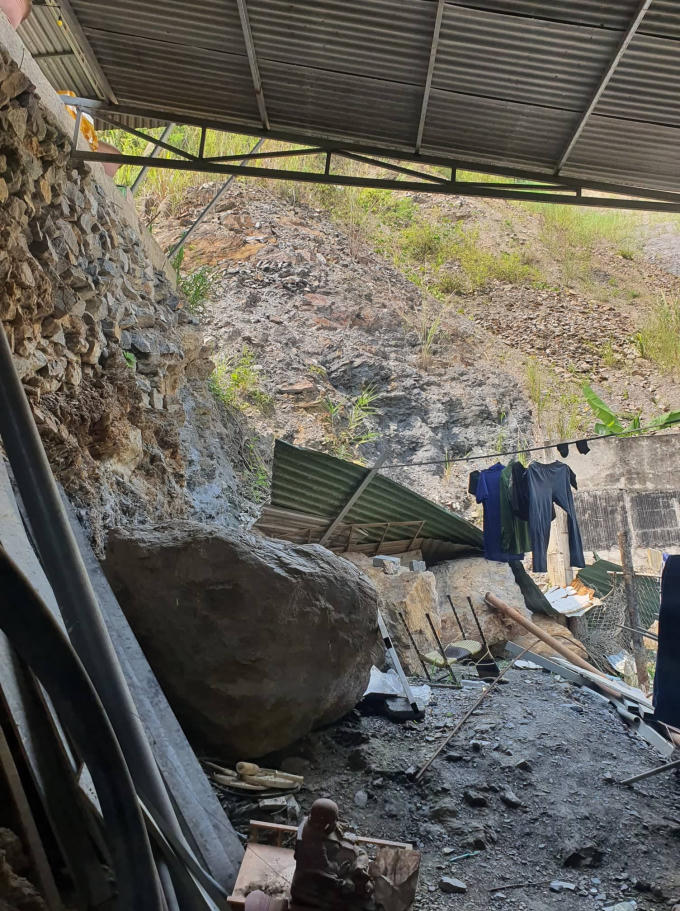 Tại ngôi nhà ngay sát khu vực hạ tầng phân lô về phía đông, chúng tôi không khỏi giật mình khi ngôi nhà bị nứt nẻ nhiều bởi ảnh hưởng của tình trạng sạt lở đất. Phía ngoài tường nhà, các tảng đá có kích thước lên cả 1 m3 còn lăn lóc như minh chứng cho sự “hiểm nguy” với tình trạng sạt lở nơi đây.