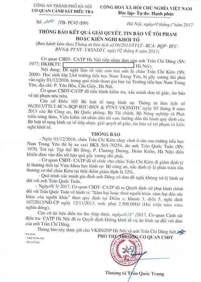 Cơ quan cảnh sát điều tra (Công an Hà Nội) đã ra thông báo giải quyết về vụ tai nạn của cháu Trần Chí Kiên tại trường Tiểu học Nam Trung Yên.