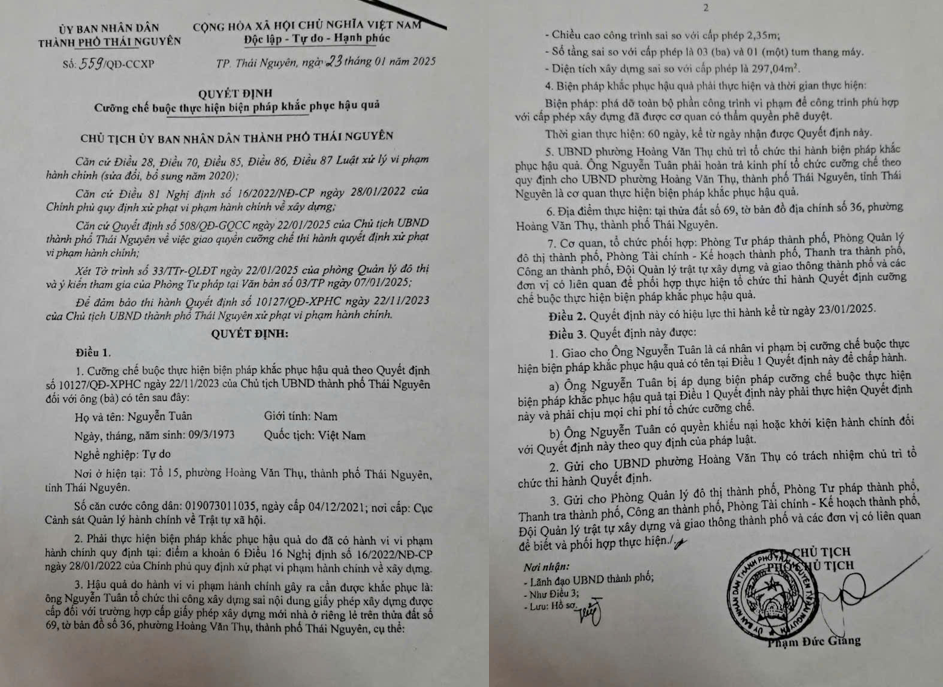 Mãi gần đây, ngày 23/01/2025, Chủ tịch UBND TP Thái Nguyên đã ban hành Quyết định số 559/QĐ-CCXP về việc cưỡng chế bắt buộc phá dỡ toàn bộ phần công trình vi phạm của ông Tuân, với các sai phạm cụ thể như sau: Chiều cao công trình vượt giấy phép: 2,35m; Số tầng vượt giấy phép: 03 tầng và 01 tum thang máy; Diện tích xây dựng vượt giấy phép: 297,04 m².