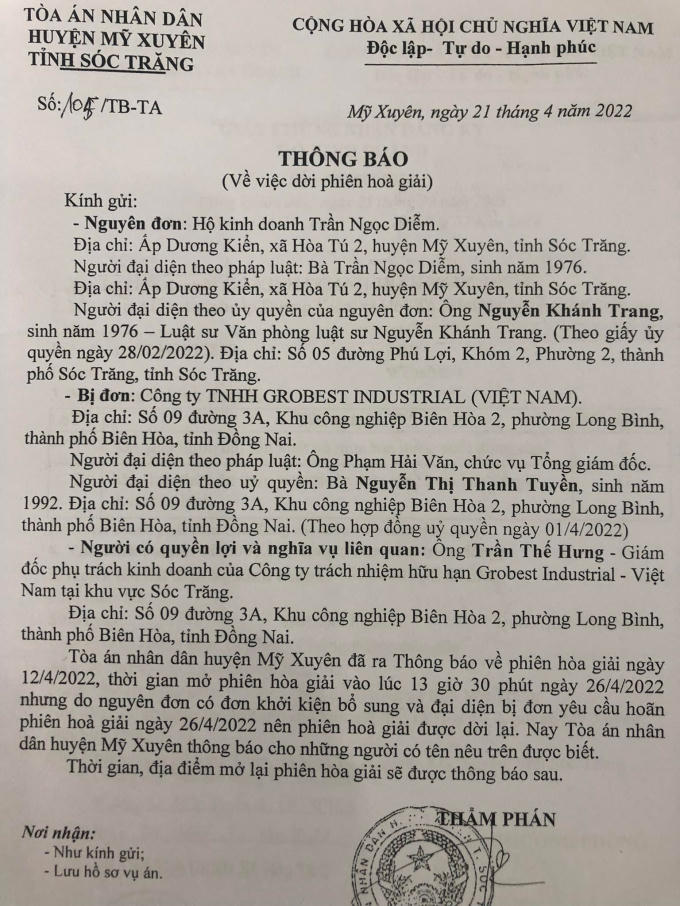 Được biết, sau khi bà Diễm khởi kiện, TAND huyện Mỹ Xuyên đã có thông báo thụ lý vụ án và tiến hành phiên hòa giải vào ngày 6/4/2022 nhưng phải hoãn vì vắng mặt ông Trần Thế Hưng, Giám đốc phụ trách kinh doanh của Công ty Grobest Việt Nam tại khu vực Sóc Trăng (là người có quyền lợi và nghĩa vụ liên quan)…