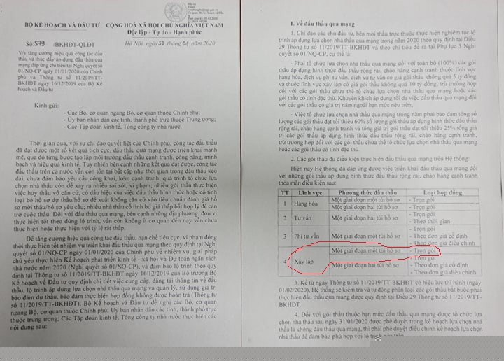 Công văn 579/BKHĐT-QLĐT ngày 30/1/2020 của Bộ KH&ĐT quy định rất rõ đối với gói thầu áp dụng hình thức đấu thầu rộng rãi, chào hàng cạnh tranh thỏa mãn điều kiện là lĩnh vực xây lắp, phương thức đấu thầu một giai đoạn một túi hồ sơ, loại hợp đồng trọn gói đều phải đấu thầu qua mạng tuy nhiên trong công văn số 507 của Công ty Than Mông Dương trả lời Báo điện tử Đảng Cộng sản Việt Nam lại khẳng định gói thầu theo Quyết định số 1056 không phải đấu thầu qua mạng (?)!.