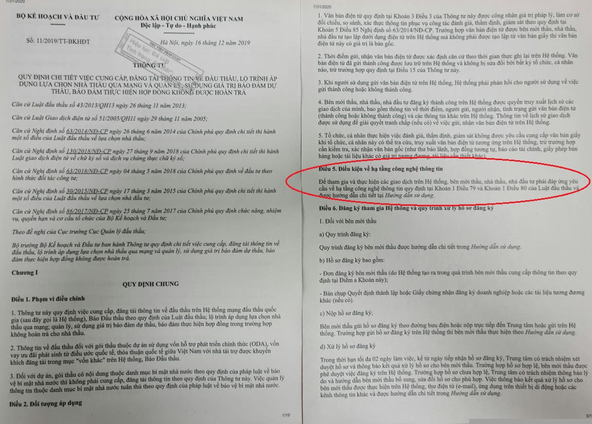 Bên cạnh đó, Theo Điều 5: Điều kiện về hạ tầng công nghệ thông tin của Thông tư 11/2019/TT-BKHĐT: Để tham gia và thực hiện các giao dịch trên Hệ thống, bên mời thầu, nhà thầu, nhà đầu tư phải đáp ứng yêu cầu về hạ tầng công nghệ thông tin quy định tại Khoản 1 Điều 79 và Khoản 1 Điều 80 của Luật đấu thầu và được hướng dẫn chi tiết.. Do vậy, không thể có trường hợp ngoại lệ với bất cứ lý do nào và tất cả đều phải tuần thủ theo quy định của Luật Đấu thầu. Cơ quan chức năng có thẩm quyền cần phải giám sát, thanh tra, kiểm tra việc thực hiện các quy định về đấu thầu. Nếu phát hiện có sai phạm, tiêu cực thì phải xử lý nghiêm minh theo quy định của pháp luật hiện hành”.