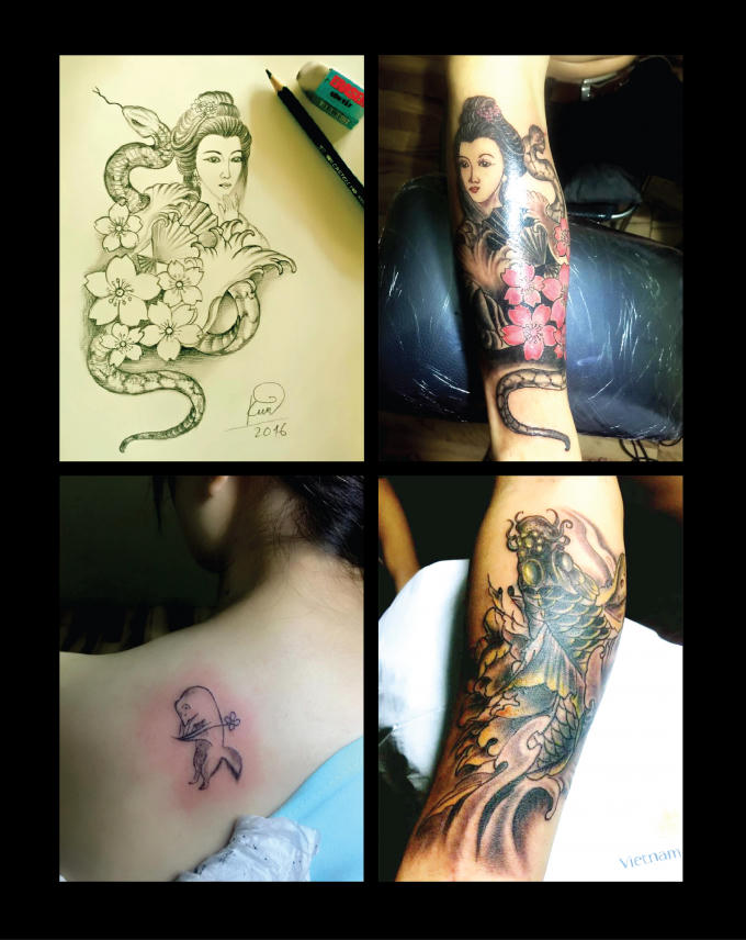 Do đó, thoáng chốc anh bỏ ngang công việc để tự sáng tạo nghệ thuật xăm hình riêng cho mình. Với anh, việc vẽ trên giấy , trên lụa,trên tường hay gỗ…cũng giống như việc chúng tôi vẽ trên da của khách xăm,dù trên chất liệu nào thì cũng là một tác phẩm nghệ thuật.