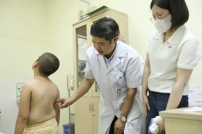 Bác sỹ khám, tư vấn cho bệnh nhi cong vẹo cột sống. (Ảnh: Minh Quyết/TTXVN)