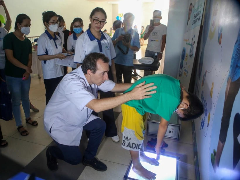 Khám tầm soát bệnh vẹo cột sống cho trẻ em. (Ảnh: Trần Lê Lâm/TTXVN)