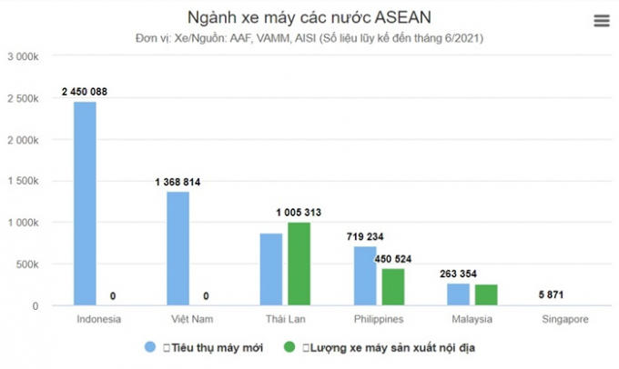 Indonesia và Việt Nam hiện xếp lần lượt thứ ba và thứ tư trên thế giới về tiêu thụ xe máy mới hàng năm, sau Ấn Độ và Trung Quốc. Hai hiệp hội xe máy Việt Nam và Indonesia không công bố số lượng xe sản xuất nội địa. Riêng Việt Nam, xe máy bán ra hầu hết đều sản xuất nội địa và con số thực tế cao hơn bởi các hãng môtô và xe máy khác không thuộc Hiệp hội các nhà sản xuất xe máy Việt Nam (VAMM).