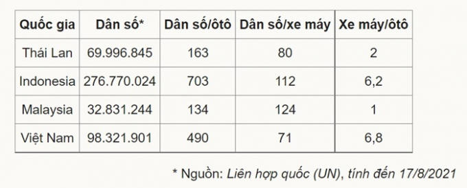 Bảng thống kê tỷ lệ ôtô, xe máy mới bán ra nửa đầu 2021 so với dân số của một số nước ASEAN: