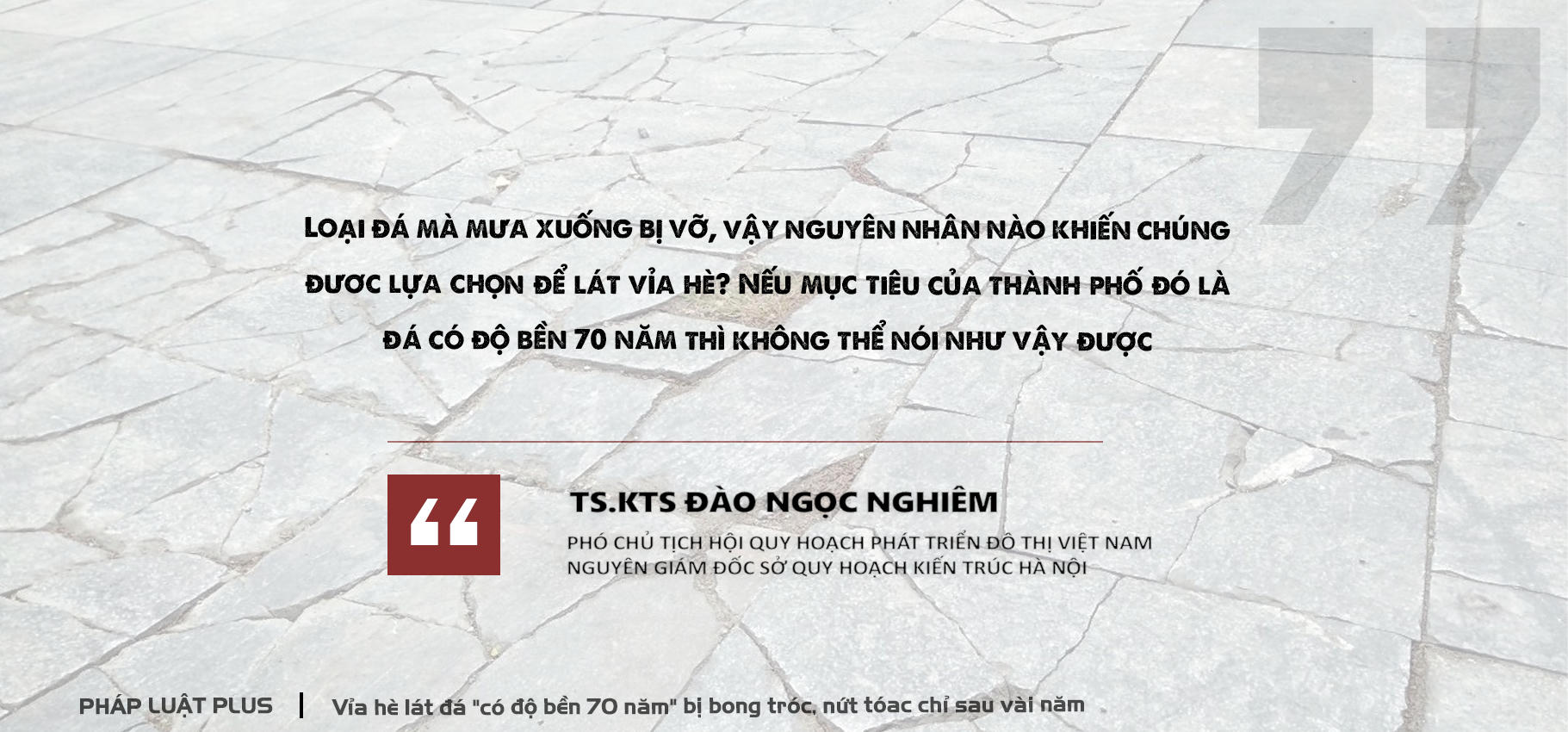 TS.KTS Đào Ngọc Nghiêm chia sẻ: “Nếu nói đá tự nhiên bị nứt, vỡ do thời tiết thì tại sao lại đặt ra mục tiêu có độ bền 70 năm khi dùng đá để lát vỉa hè thay loại đá trước đây? Tại sao chúng ta không sử dụng vật liệu khác có lợi ích kinh tế hơn, thay đổi thường xuyên được, tiết kiệm ngân sách.