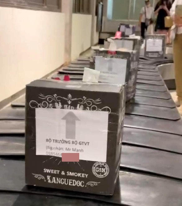 Trước đó, một video clip ghi lại cảnh hàng chục kiện hàng được đóng trong vỏ các hộp rượu ngoại, bên ngoài dán giấy A4, ghi "Bộ trưởng Bộ GTVT", người nhận Mr Manh, số điện thoại 0989.464.xxx, trên băng chuyền hành lý sân bay Tân Sơn Nhất.