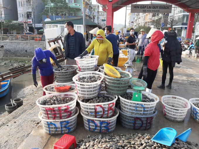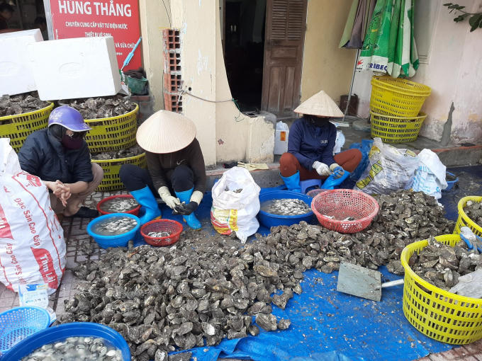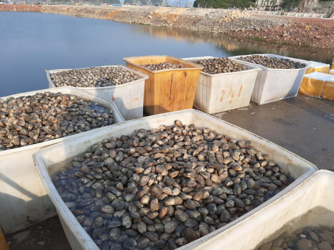 Ngao hai cùi được người dân thu hoạch chờ thương lái đến để chuyển đi.
