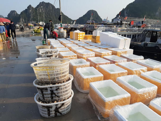Số hải sản được đóng vào thùng xốp để chuyển đi tiêu thụ.