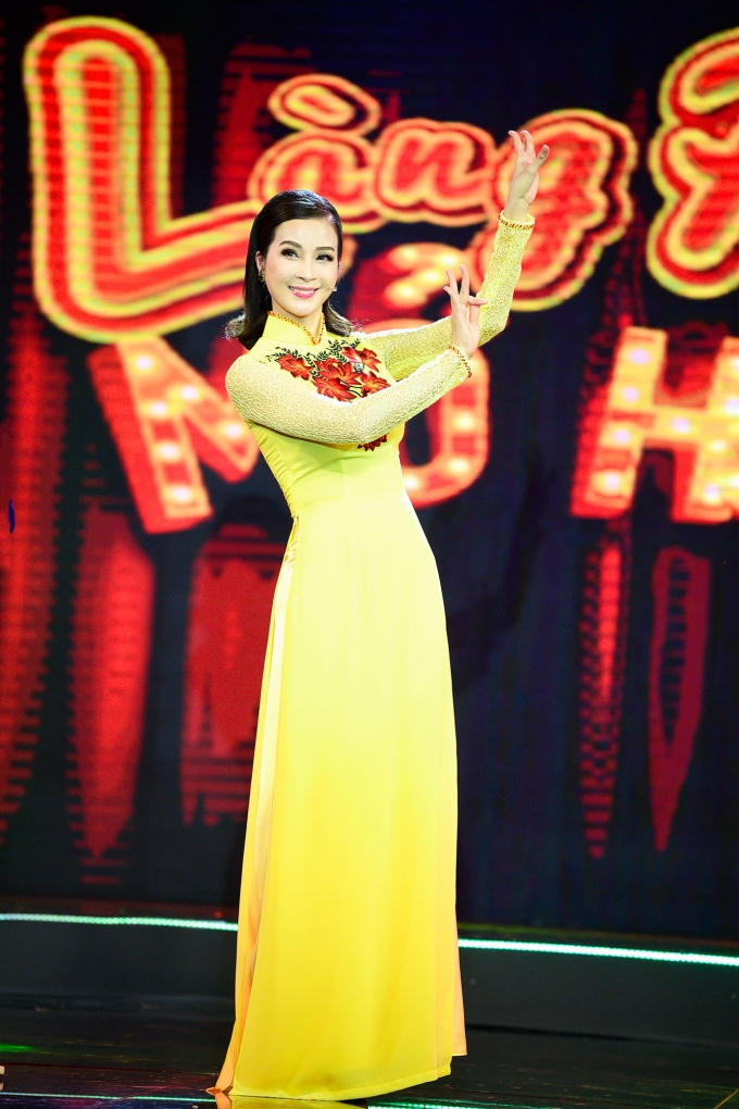 Có mặt tại trường quay từ sớm với chiếc áo dài vàng rực rỡ họa tiết hoa được thêu tay của nhà thiết kế Thuận Việt, Thanh Mai khiến các đồng nghiệp cũng như khán giả bất ngờ với vẻ đẹp không tuổi của chị.