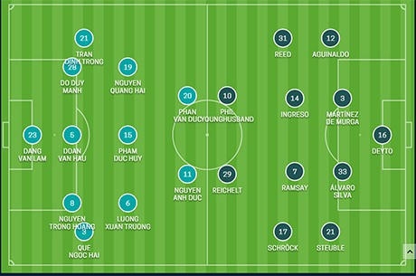 Việt Nam: Văn Lâm, Ngọc Hải, Đình Trọng, Duy Mạnh, Văn Hậu, Trọng Hoàng, Xuân Trường, Đức Huy, Quang Hải, Anh Đức, Văn Đức.