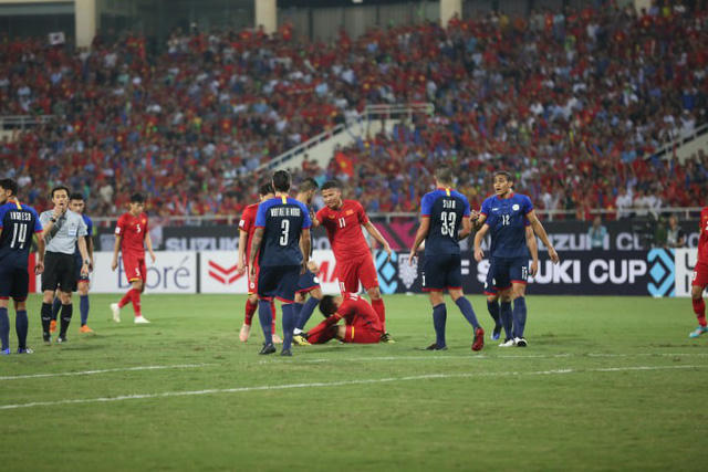 Phút 18: Reichelt của Philippines đã bị đau khi sau va chạm đầu ở tình huống tranh chấp trên không với hậu vệ Việt Nam. Trận đấu phải tạm dừng.