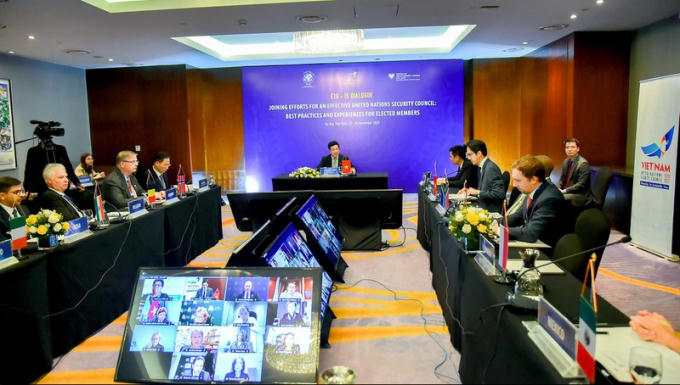Cuộc họp với chủ đề “Nỗ lực chung vì Hội đồng Bảo an Liên hợp quốc (HĐBA LHQ) hiệu quả: kinh nghiệm và bài học tốt cho các nước mới trúng cử Ủy viên không thường trực” diễn ra dưới hình thức kết hợp giữa trực tuyến và trực tiếp từ Hà Nội.