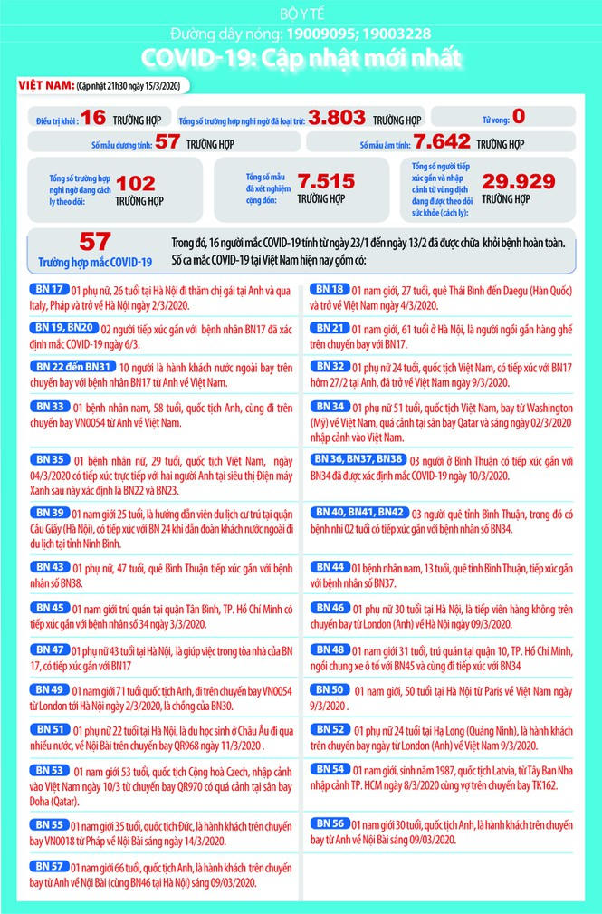 - 01 phụ nữ, 26 tuổi, tại Hà Nội đi thăm chị gái tại Anh và qua Italy, Pháp và trở về Hà Nội ngày 2/3/2020 (Bệnh nhân 17-BN17).- 01 nam giới, 27 tuổi, quê Thái Bình đến Daegu (Hàn Quốc) và trở về Việt Nam ngày 4/3/2020 (BN18).- 02 người tiếp xúc gần với BN17 đã xác định nhiễm Covid-19 ngày 6/3 (BN19, BN20).-01 nam giới, 61 tuổi ở Hà Nội, là người ngồi gần hàng ghế trên chuyến bay với BN17 (BN21).- 10 người là hành khách nước ngoài bay trên chuyến bay với BN17 từ Anh về Việt Nam (từ BN22 đến BN31).- 01 phụ nữ 24 tuổi, quốc tịch Việt Nam, có tiếp xúc với BN17 ngày 27/2 tại Anh, đã trở về Việt Nam ngày 9/3/2020 (BN32).- 01 bệnh nhân nam, 58 tuổi, quốc tịch Anh, cùng đi trên chuyến bay VN0054 từ Anh về Việt Nam (BN33).- 01 phụ nữ 51 tuổi, quốc tịch Việt Nam, bay từ Washington (Mỹ) về Việt Nam, quá cảnh tại sân bay Qatar và sáng ngày 2/3/2020 nhập cảnh vào Việt Nam (BN34).- 01 bệnh nhân nữ, 29 tuổi, quốc tịch Việt Nam, ngày 4/3/2020 có tiếp xúc trực tiếp với hai người Anh tại siêu thị Điện máy Xanh sau này xác định là BN22 và BN23. (BN35).- 03 người ở Bình Thuận có tiếp xúc gần với BN34 đã được xác định mắc Covid-19 ngày 10/3/2020 (BN36, BN37, BN38).- 01 nam giới 25 tuổi, là hướng dẫn viên du lịch cư trú tại quận Cầu Giấy (Hà Nội), có tiếp xúc với BN24 khi dẫn đoàn khách nước ngoài đi du lịch tại tỉnh Ninh Bình (BN39).- 03 người gồm bé gái 2 tuổi, nam giới 59 tuổi và nam giới 28 tuổi quê ở thành phố Phan Thiết, tỉnh Bình Thuận có tiếp xúc gần với BN34 (BN40, BN41, BN42).- 01 nữ giới 47 tuổi, quê quán thành phố Phan Thiết, Bình Thuận tiếp xúc gần với BN38 (con dâu của BN34) (BN43).- 01 nam thiếu niên 13 tuổi, quê quán huyện Hàm Thuận Bắc, tỉnh Bình Thuận, tiếp xúc gần với BN37 (nhân viên của BN34) (BN44).- 01 nam giới trú quán tại quận Tân Bình, TP. Hồ Chí Minh có tiếp xúc gần với BN34 ngày 4/3/2020 (BN45).- 01 người phụ nữ, 30 tuổi tại Hà Nội, là tiếp viên hàng không trên chuyến bay London (Anh) về Hà Nội ngày 9/3/2020 (BN46)- 01 phụ nữ, 43 tuổi tại Hà Nội, là giúp việc trong toà nhà của BN17, có tiếp xúc gần với BN17 (BN47)- 01 nam giới 31 tuổi, trú quán tại quận 10, thành phố Hồ Chí Minh, ngồi chung xe ô tô với BN45 và cùng đi tiếp xúc với BN34 (BN48).- 01 nam giới 71 tuổi quốc tịch Anh, đi trên chuyến bay VN0054 từ London tới Hà Nội ngày 2/3/2020, là chồng của BN30 (BN49). - 01 nam giới, 50 tuổi tại Hà Nội từ Paris về Việt Nam ngày 9/3/2020 (BN50).- 01 phụ nữ 22 tuổi tại Hà Nội, là du học sinh ở Châu Âu đi qua nhiều nước, về Nội Bài trên chuyến bay QR968 ngày 11/3/2020 (BN51).- 01 phụ nữ 24 tuổi tại Hạ Long (Quảng Ninh), là hành khách trên chuyến bay từ London (Anh) về Việt Nam ngày 9/3/2020 (BN52)- 01 nam giới 53 tuổi, quốc tịch Cộng hoà Czech, nhập cảnh vào Việt Nam ngày 10/3 từ chuyến bay QR970 có quá cảnh tại sân bay Doha (Qatar). (BN53)