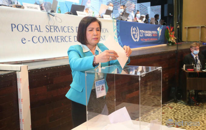 Bà Lê Thị Tuyết Mai, Đại sứ, Trưởng phái đoàn của Việt Nam dự trực tiếp Đại hội tại Bờ Biển Ngà tham gia bỏ phiếu tại Đại hội UPU lần thứ 27. (Ảnh: Vụ Hợp tác quốc tế)