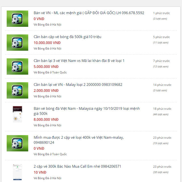 Chỉ vài giờ sau khi vé trận Việt Nam - Malaysia được mở bán, trên các web bán vé chợ đen online, giá vé trận đấu này đã được đẩy lên gấp rất nhiều lần so với giá gốc.