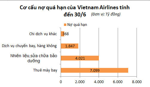 Khoản còn lại là 1.847 tỷ nợ dịch vụ chuyến bay, dịch vụ hàng không của các đối tác trong nước như: Tổng công ty Quản lý bay (VATM), Công ty TNHH MTV Kỹ thuật máy bay (VAECO), Tổng công ty Cảng hàng không Việt Nam (ACV) cùng các đối tác khác. Cuối cùng là 368 tỷ đồng tiền nợ chi các dịch vụ khác.