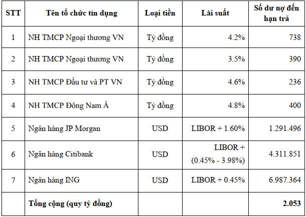 Trong đó, Vietcombank là chủ nợ trong nước lớn nhất với khoản nợ 738 tỷ đồng lãi suất 4.2% và 390 tỷ đồng lãi suất 3,5%. Ngân hàng BIDV với số dư nợ sắp đến hạn là 236 tỷ đồng lãi suất 4,6%. Ngân hàng, SeABank có dư nợ sắp đến hạn phải thanh toán là 400 tỷ đồng lãi suất 4,8%