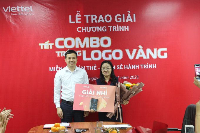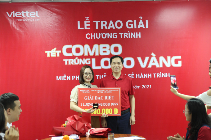 Sau khi có kết quả quay số, Viettel Hà Giang đã tiến hành trao giải cho các khách hàng may mắn trúng trưởng theo đúng quy trình, quy định. Trong đó, trao giải Đặc biệt của chương trình “Tết Combo – Trúng Logo Vàng” trị giá 1 lượng vàng DOJI 9999 cho chị Trần Thị Kim Oanh, trú tại tổ 14, thị trấn Vị Xuyên (Vị Xuyên); trao giải Nhì chương trình “Miễn phí dán thẻ, suôn sẻ đồng hành” là 1 chiếc iPhone Pro Max 256GB cho chị Vi Chi Na, tổ 2, thị trấn Tam Sơn (Quản Bạ).