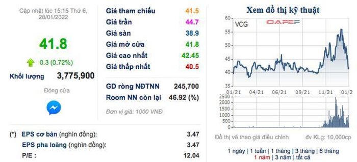 Trên thị trường cổ phiếu VCG sau khi tăng mạnh lên vùng giá 56.000 đồng/cổ phiếu (đóng cửa phiên giao dịch ngày 5/1/2022) thì hiện đã giảm về vùng giá 41.800 đồng/cổ phiếu.