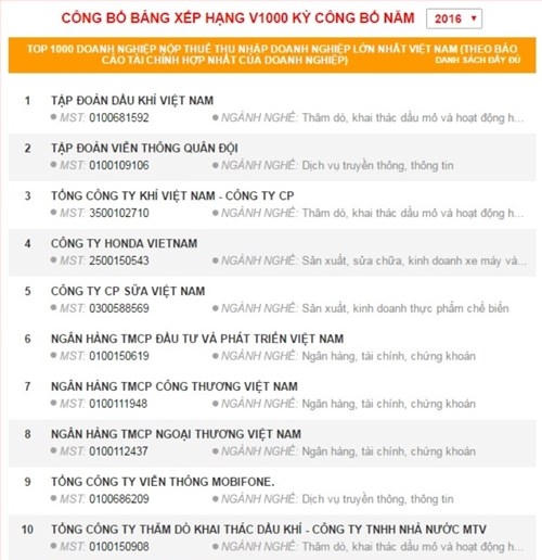 Trong Bảng xếp hạng V1000 – 1.000 Doanh nghiệp nộp thuế thu nhập doanh nghiệp lớn nhất Việt Nam năm 2016, Vinamilk đã đứng top 5, đây cũng là lần đầu tiên ghi nhận sự có mặt của một doanh nghiệp tư nhân trong top đầu của danh sách.