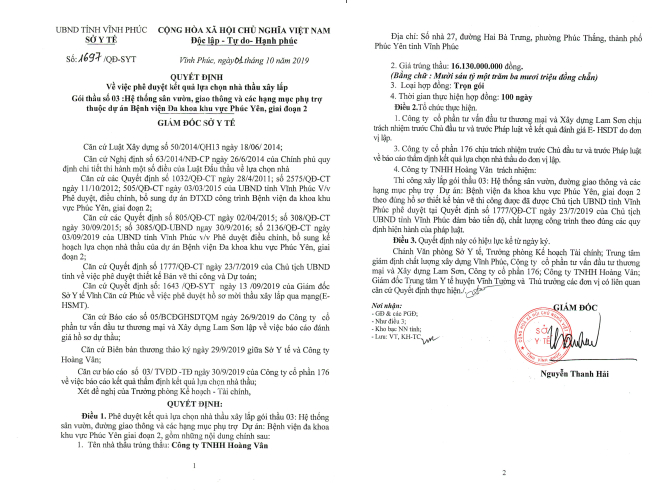 Vẫn điệp khúc trúng thầu sát giá, tại Quyết định 1697/QĐ-SYT ngày 1/10/2019 về việc phê duyệt kết quả lựa chọn nhà thầu xây lắp cho gói thầu số 03: Hệ thống sân vườn, giao thông và các hạng mục phụ trợ thuộc dự án Bệnh viện Đa khoa khu vực Phúc Yên, giai đoạn 2.