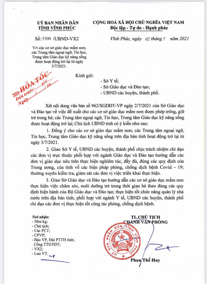 Chiều ngày 2/7, Ủy ban Nhân dân (UBND) tỉnh Vĩnh Phúc đã có văn bản số 5300/UBND-VX2 về việc cho phép các cơ sở giáo dục mầm non, các trung tâm ngoại ngữ, tin học, trung tâm giáo dục kĩ năng sống được hoạt động trở lại. Thời gian bắt đầu thực hiện từ ngày 3/7/2021.