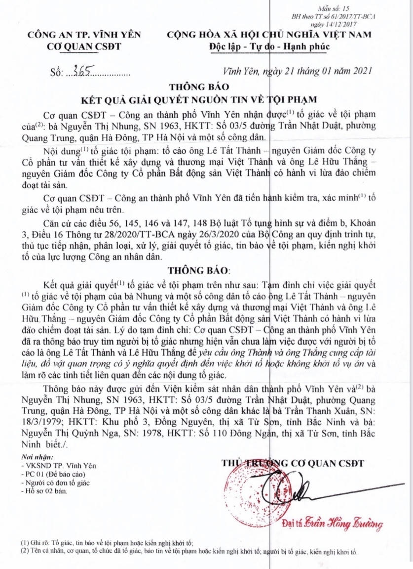 Ngày 02/3/2020, Cơ quan Cảnh sát điều tra Công an tỉnh Vĩnh Phúc ký Thông báo số 391/TB về việc truy tìm người bị tố giác là ông Lê Tất Thành - Giám đốc Công ty Cổ phần tư vấn Việt Thành có hành vi lừa đảo chiếm đoạt tài sản do trong quá trình điều tra Cơ quan Cảnh sát điều tra Công an tỉnh Vĩnh Phúc đã nhiều lần xác minh, triệu tập nhưng ông Thành không có mặt tại địa phương và chưa xác định được ông Thành đang làm gì, ở đâu. Đến ngày 01/9/2020, Cơ quan Cảnh sát điều tra Công an thành phố Vĩnh Yên tiếp tục ra Thông báo truy tìm người bị tố giác đối với ông Lê Tất Thành và ông Lê Hữu Thắng nhưng chưa có kết quả.