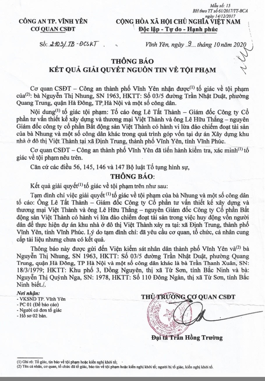 Ngày 03/12/2019, Cơ quan Cảnh sát điều tra Công an thành phố Vĩnh Yên tiếp nhận đơn Tố giác tội phạm của bà Trần Thanh Xuân và đã có buổi làm việc trực tiếp với người tố giác tội phạm và đại diện theo ủy quyền pháp luật - Công ty Luật TNHH Việt Kim (ngày 23/12/2019) về hành vi của ông Lê Tất Thành, Lê Hữu Thắng có dấu hiệu tội phạm “Lừa đảo chiếm đoạt tài sản” được quy định tại Điều 174 Bộ luật Hình sự 2015. Công ty TNHH Luật Việt Kim đã cung cấp hồ sơ, tài liệu có liên quan cho cơ quan điều tra.