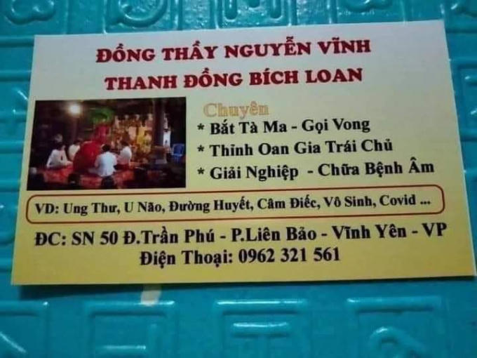 Trước đó, cuối tháng 3, mạng xã hội lan truyền thông tin về tấm danh thiếp có nội dung cô đồng với tên "Đồng Thầy Ng.V.Th.Đ.B.L." chuyên bắt tà ma, gọi vong, thỉnh oan gia trái chủ. Đặc biệt, trên card còn giới thiệu cô đồng có thể chữa được các bệnh như ung thư, u não, đường huyết, vô sinh, Covid-19… Theo đó, trên danh thiếp có địa chỉ tại đường Trần Phú (Phường Liên Bảo, TP Vĩnh Yên, tỉnh Vĩnh Phúc). Cùng với đó là điện thoại liên hệ tới địa chỉ tới nơi chữa bệnh.