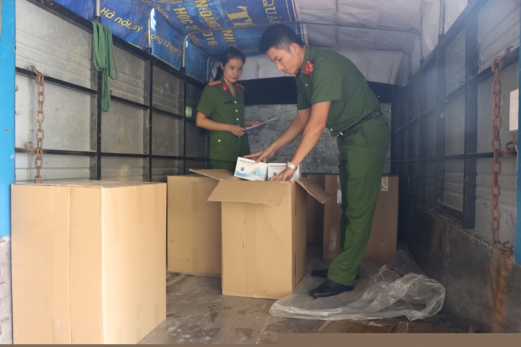 Kiểm tra trên xe, tổ công tác phát hiện có hàng chục thùng carton bên trong chứa nhiều hộp khẩu trang y tế, số lượng khoảng 125 nghìn chiếc.