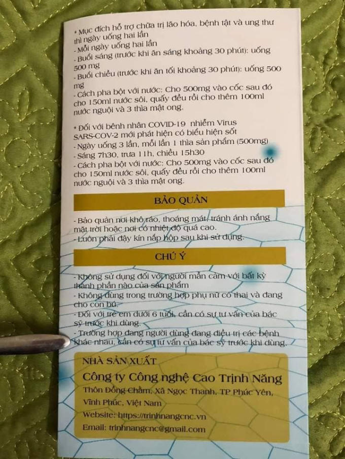 Thông tin về sản phẩm được in ấn giới thiệu có tác dụng chống ung thư, covid