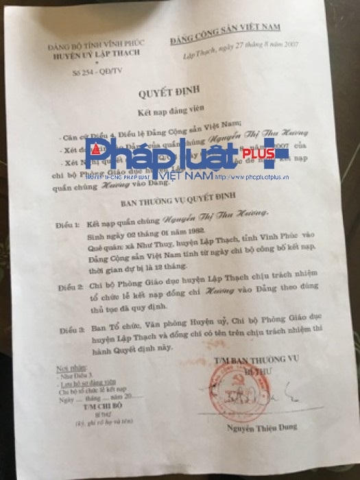 Qua tìm hiểu được biết, đầu tháng 6/2016, UBND huyện Sông Lô khi làm thủ tục bổ nhiệm bà Nguyễn Thị Thu Hương (sinh năm 1982) làm Trưởng Phòng Giáo dục thay cho ông Vũ Kim Sơn (đến tuổi nghỉ hưu) mới phát hiện bà Hương… thiếu hồ sơ Đảng viên?