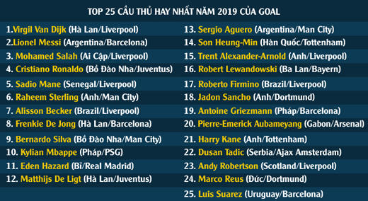 Ở cuộc bình chọn năm nay, Cristiano Ronaldo chỉ về đích thứ 4, xếp sau Van Dijk, Messi và Mohamed Salah. Trong top 25 cầu thủ nam được Goal 50 vinh danh, Liverpool chiếm thế áp đảo với 7 cái tên. Ngoài Van Dijk và Salah, Liverpool còn có 5 tên tuổi khác là Sadio Mane (thứ 5), Alisson Becker (thứ 7), Trent Alexander-Arnold (thứ 15), Roberto Firmino (thứ 17) và Andy Robertson (thứ 23).