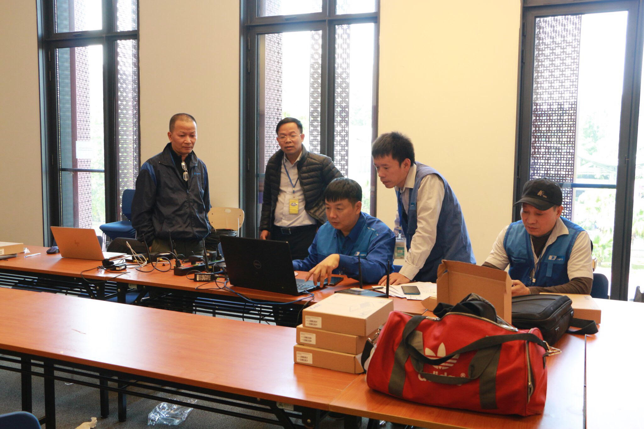 Nhân viên kỹ thuật VNPT Hà Nội hoàn thiện đấu nối, cấu hình, chạy thử các dịch vụ VT-CNTT sẵn sàng phục vụ Đại hội