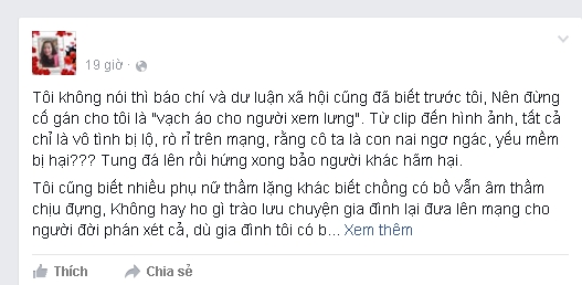 Tôi không nói thì báo chí và dư luận xã hội cũng đã biết trước tôi, Nên đừng cố gán cho tôi là "vạch áo cho người xem lưng". Từ clip đến hình ảnh, tất cả chỉ là vô tình bị lộ, rò rỉ trên mạng, rằng cô ta là con nai ngơ ngác, yếu mềm bị hại??? Tung đá lên rồi hứng xong bảo người khác hãm hại.