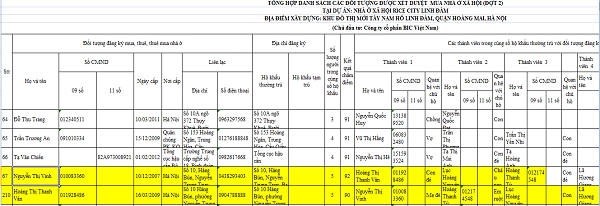 Cụ thể, trong danh sách được mua nhà đợt 2 tại dự án Rice City đăng tải trên website Sở Xây dựng Hà Nội, tại số thứ tự 67 có trường hợp bà Nguyễn Thị Vinh (hộ khẩu thường trú Số 10, Hàng Bún, Nguyễn Trung Trực, Ba Đình, Hà Nội), còn số 210 là bà Hoàng Thị Thanh Vân (hộ khẩu thường trú Số 10, Hàng Bún, Nguyễn Trung Trực, Ba Đình, Hà Nội).