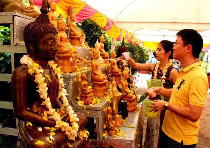 Ngày đầu năm mới, mọi người trong nhà đều ngồi xếp chân một phía trước bàn thờ, chắp tay vái cầu nguyện để xin tận hưởng phước lộc. Sau đó họ chọn những bộ quần áo tươi tắn để đến chùa dự lễ, nghe sư đọc kinh cầu nguyện, tưới nước thơm vào tượng Phật, dâng các loại bánh ngon lên ông bà cha mẹ, để chúc thọ và báo hiếu.