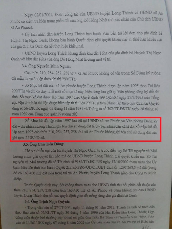 Trong khi đó, tại buổi làm việc ngày 28/11 với Đoàn công tác, ông Nguyễn Đình Nghĩa, Phó giám đốc Văn phòng Đăng ký đất đai tỉnh Đồng Nai cho biết: các thửa 210, 254, 257, 258 tờ bản đồ 04 xã An Phước không có tên trong mẫu đăng ký ruộng đất mẫu 5a và 5b lập theo chỉ thị 299/TTg; Sổ mục kê đất lập năm 1997 lưu trữ tại UBND xã An Phước và Văn phòng Đăng ký đất đai, chi nhánh Long Thành ghi tên chủ sử dụng đất là UBND xã, là do: “Sổ mục kê đất lập năm 1995 các thửa 210, 254, 257, 258 tờ 04 xã An Phước không ghi tên chủ sử dụng đất nên ghi tạm là UBND xã”.