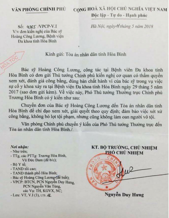 Theo đó, Công văn hoả tốc của Văn phòng Chính phủ truyền đạt ý kiến của Phó Thủ tướng thường trực Trương Hoà Bình nêu rõ: Chuyển đơn của BS Hoàng Công Lương đến TAND tỉnh Hoà Bình để chỉ đạo xem xét, giải quyết theo quy định; đảm bảo việc xét xử công bằng, không bỏ lọt tội phạm, nhưng cũng không làm oan người vô tội.