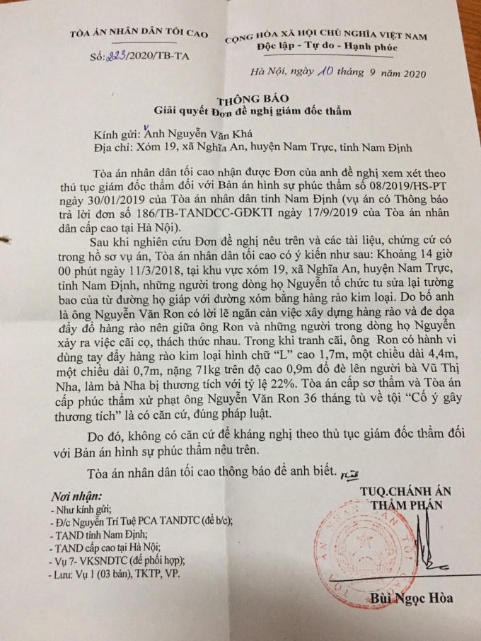 Theo đó, sau quá trình đi kêu oan cho bố mình, anh Nguyễn Văn Khá nhận được thông báo trả lời đơn đề nghị giám đốc thẩm của tòa án nhân dân tối cao, thông báo ghi số 223/2020/TB/TA, đề ngày 10/9/2020. Thông báo này khẳng định Tòa án cấp sơ thẩm và cấp phúc thẩm xử phạt ông Nguyễn Văn Ron 36 tháng tù về tội "Cố ý gây thương tích là phù hợp". Vì vậy không có căn cứ để kháng nghị theo thủ tục giám đốc thẩm đối với bản án hình sự phúc thẩm trên.