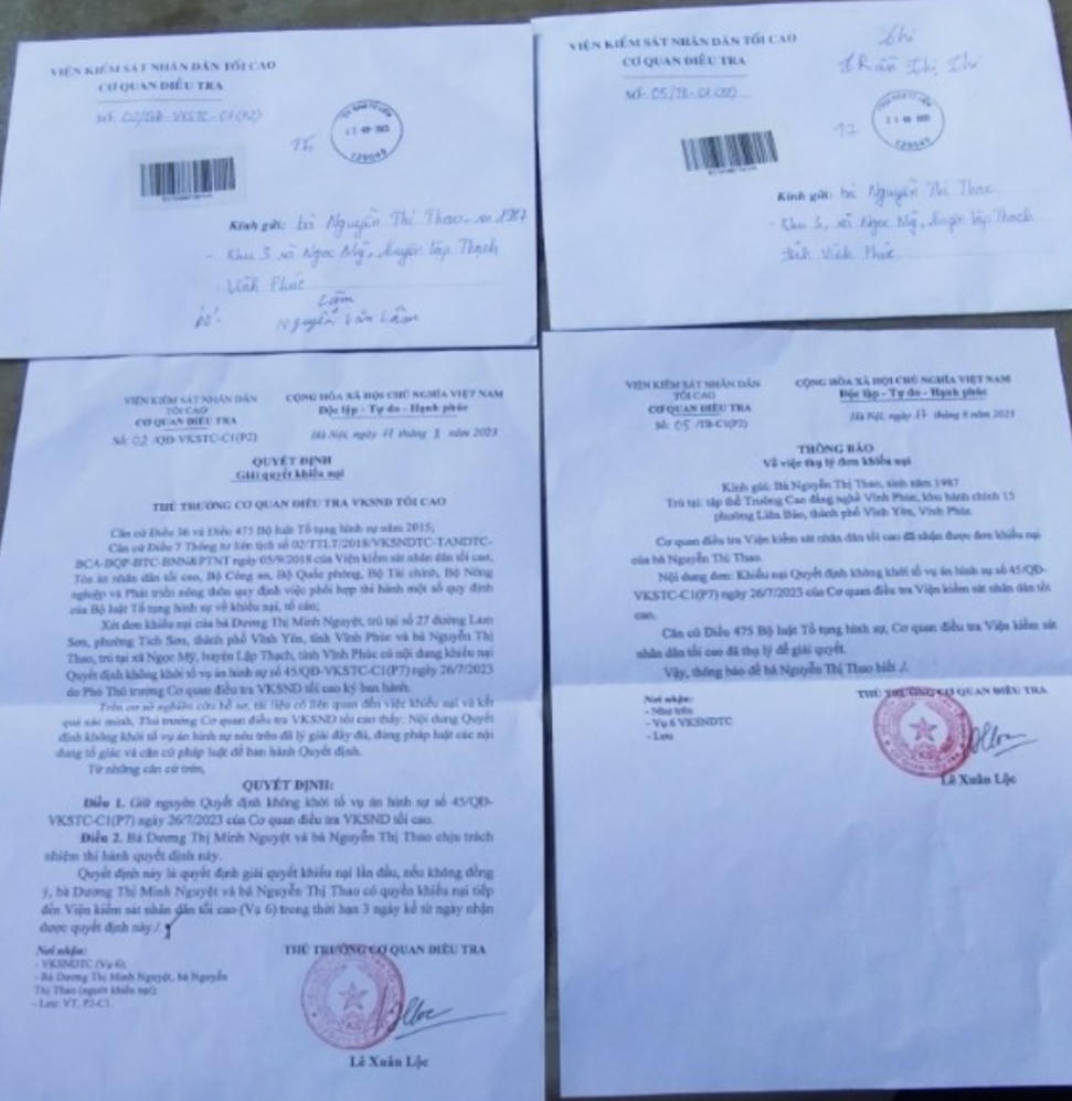 Bị cáo Thao tiếp tục khiếu nại thông báo trên, ngày 17/8/2023 bị cáo Nguyễn Thị Thao nhận được thông báo số 05/TB - VKSTC - C1(P2) với nội dung “Thụ lý đơn khiếu nại”: Khiếu nại QĐ không khởi tố hình sự số 45/QĐ-VKSTC-C1(P7) ngày 26/7/2023 thông báo này do ông Lê Xuân Lộc ký.