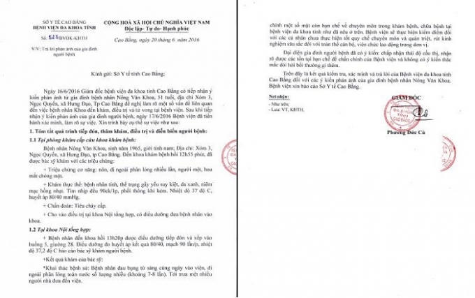 Cũng theo văn bản trả lời Sở Y tế tỉnh Cao Bằng, Bệnh viện Đa khoa tỉnh Cao Bằng trả lời những thắc mắc của gia đình người bệnh.