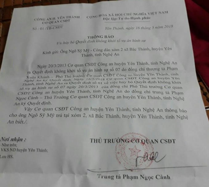 Ngày 16/5, Cơ quan cảnh sát điều tra Công an huyện Yên Thành đã ra thông báo hủy bỏ Quyết định không khởi tố vụ án hình sự đối với vụ nữ kế toán trưởng tử vong tại Nghệ An.