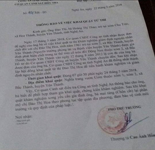Liên quan đến vụ việc này, ngày 22/5, Công an tỉnh Nghệ An cũng đã có thông báo gửi đến gia đình nạn nhân về việc quyết định khai quật tử thi chị Đào Thị Hoa để khám nghiệm.